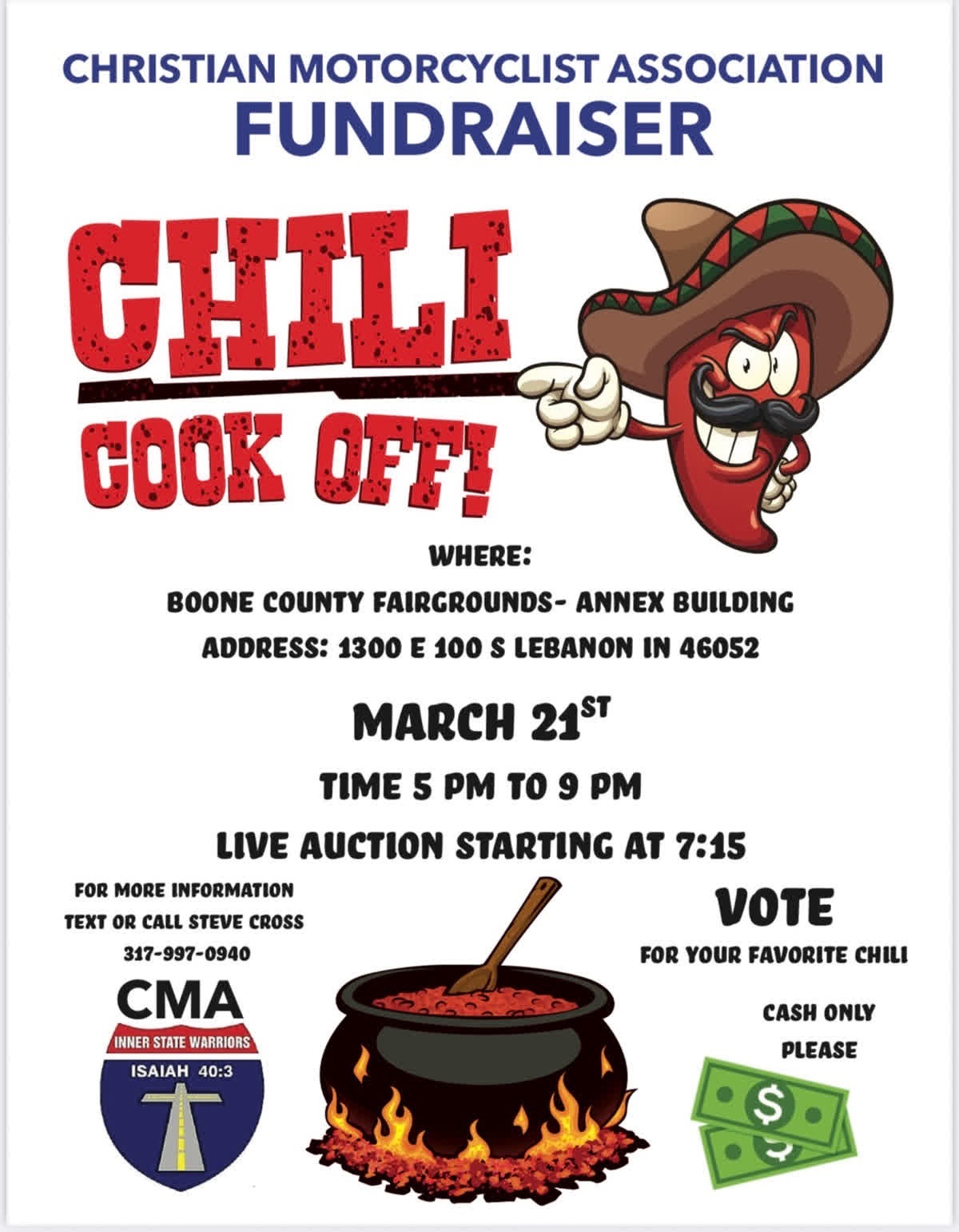 CMA (Christian Motorcycle Association) is hosting their Chili Cook-off Fundraiser on Saturday, March 31, 2026.
